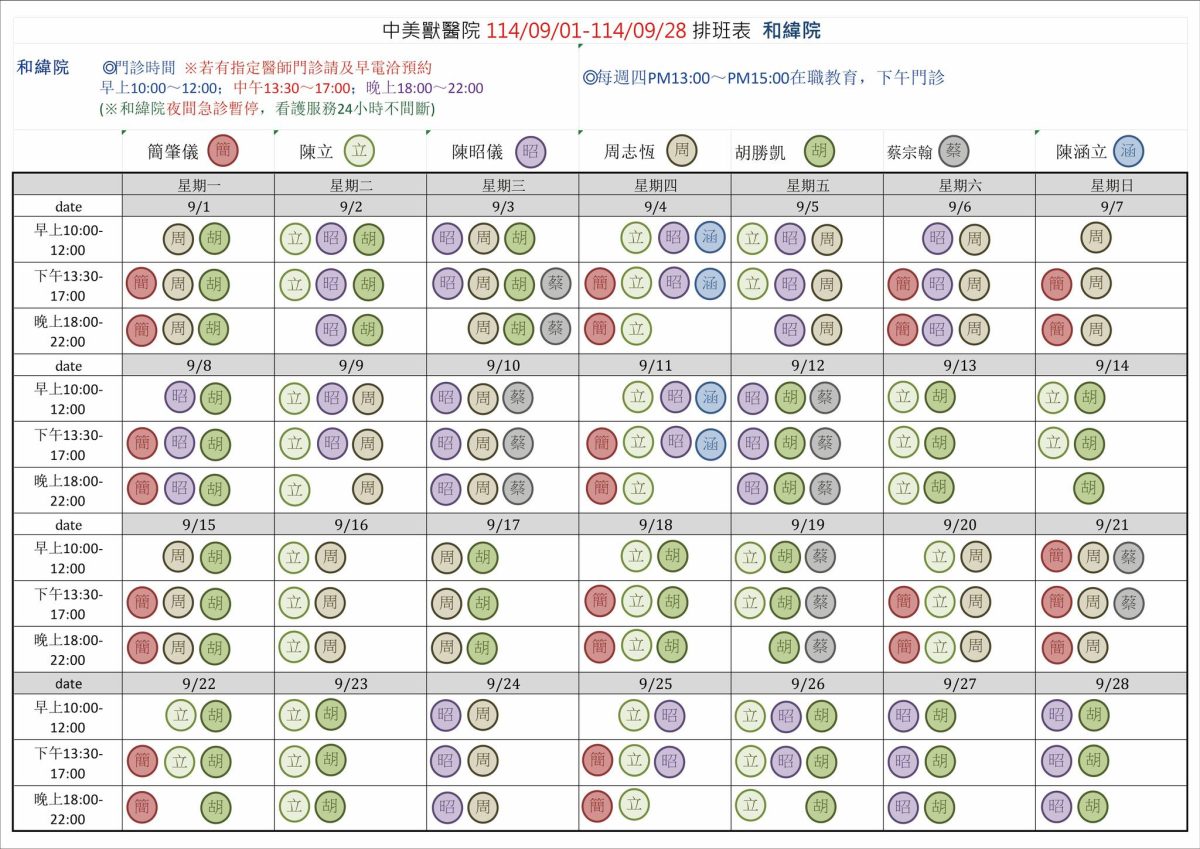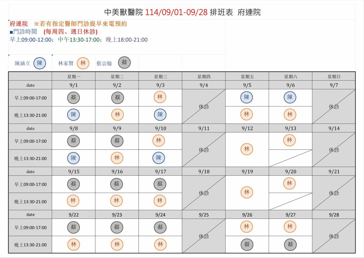 中美獸醫院 114年 09/01-09/28 班表