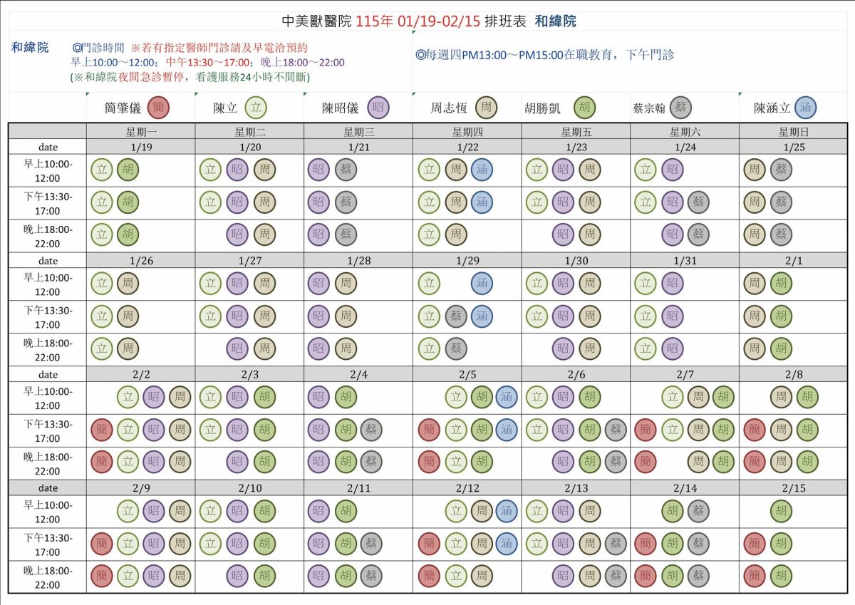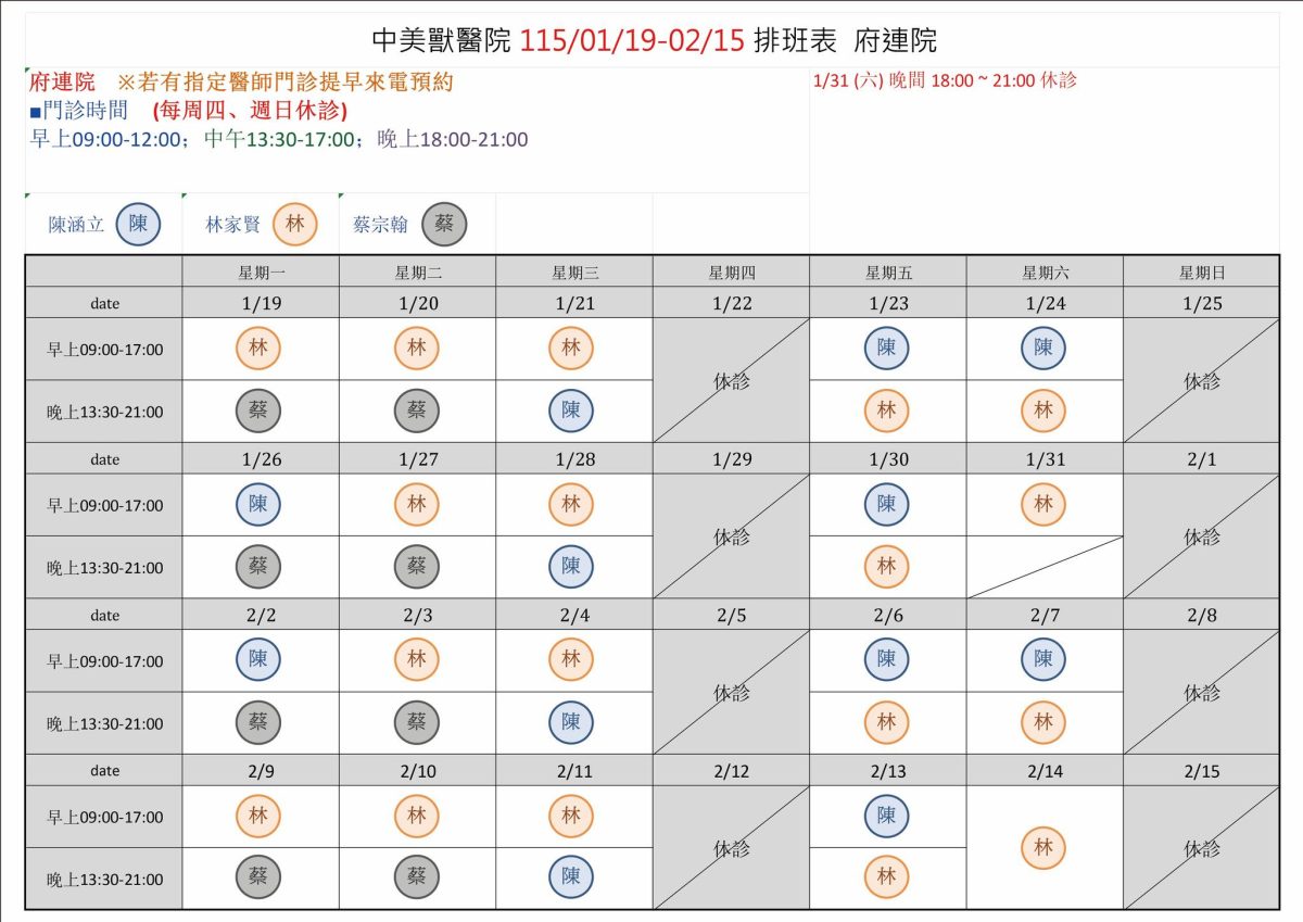 中美獸醫院 115年 01/19-02/15 班表